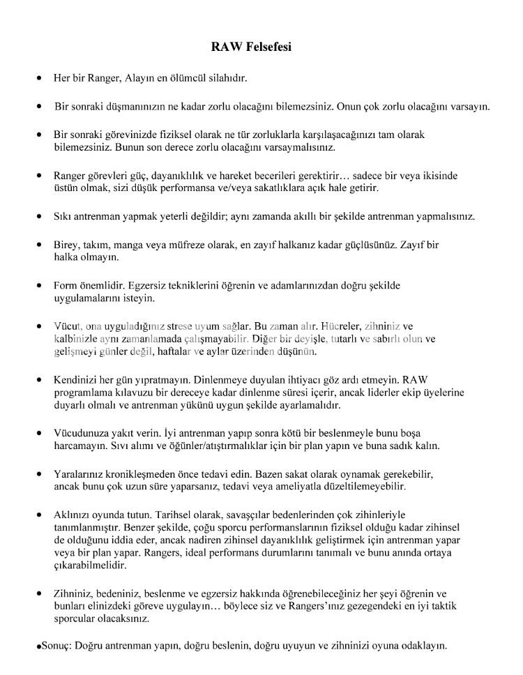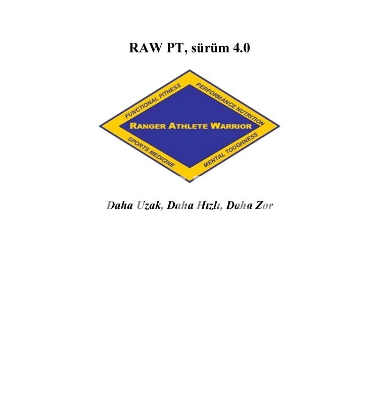 Bu eser, orijinal ABD Ordusu RAW el kitabının Türkçe çevirisidir. Askeri spor hekimliği ve fonksiyonel antrenman terminolojisi, programın bütünlüğünü koruyacak şekilde genel hatlarıyla %80 - %95 oranında Türkçeleştirilmiştir. İçerikteki programlar elit düzeyde fiziksel zorlanma içerir; uygulamadan önce kendi sağlık durumunuzu değerlendirmeniz tavsiye edilir.